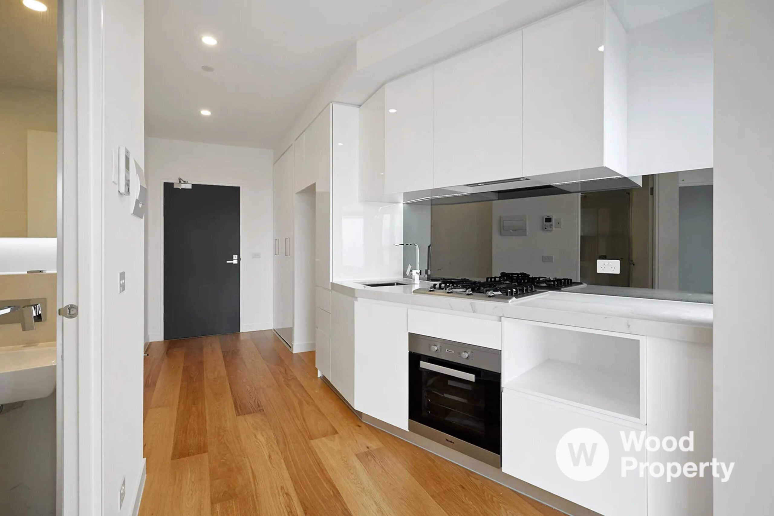 The apartment features a sleek open-plan living and dining area with timber flooring, flowing seamlessly to large windows that capture leafy outlooks and natural light. The modern kitchen is well-appointed with quality appliances, gas cooktop and ample storage, making everyday living and entertaining easy.